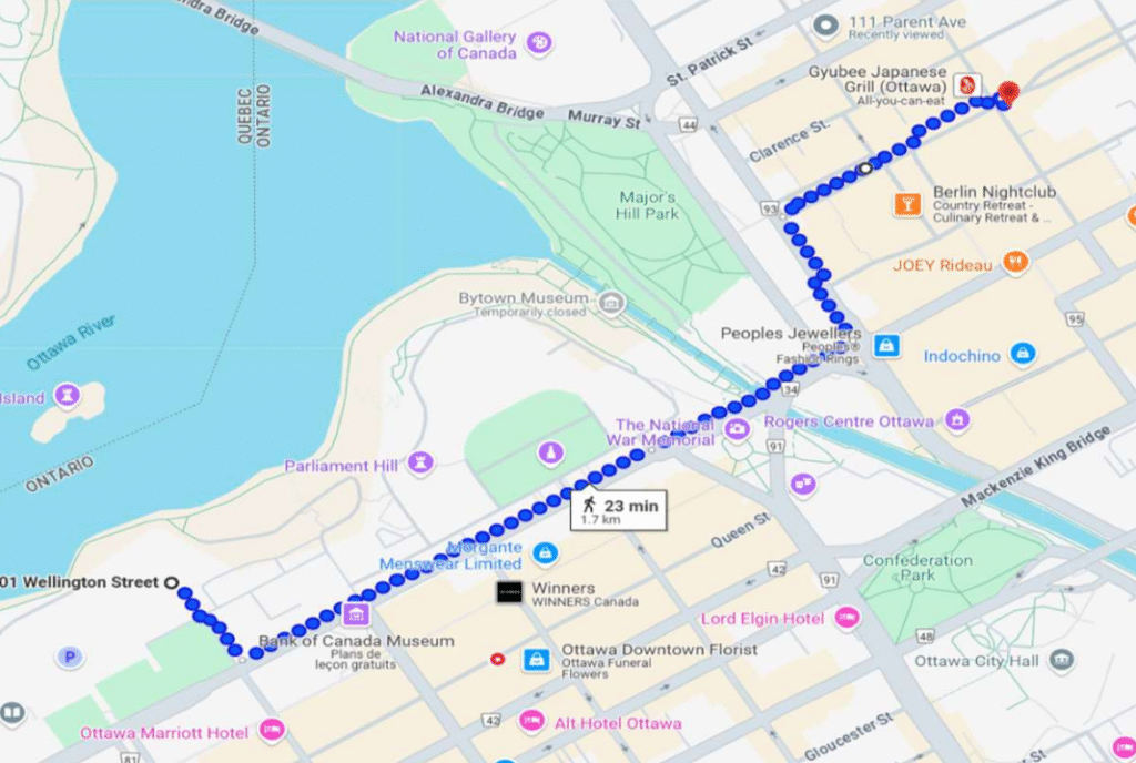 La course d’un mile sera une expérience unique : elle suivra l’itinéraire du défilé, au cœur même de la capitale. La course commencera devant la Cour suprême du Canada sur la rue Wellington. Le parcours passe ensuite devant la Colline du Parlement, traverse le canal Rideau, continue sur la promenade Sussex, tourne sur la rue York et se termine dans le dynamique marché By. C’est votre chance de courir dans certaines des rues les plus emblématiques d’Ottawa, au cœur d’une grande célébration!