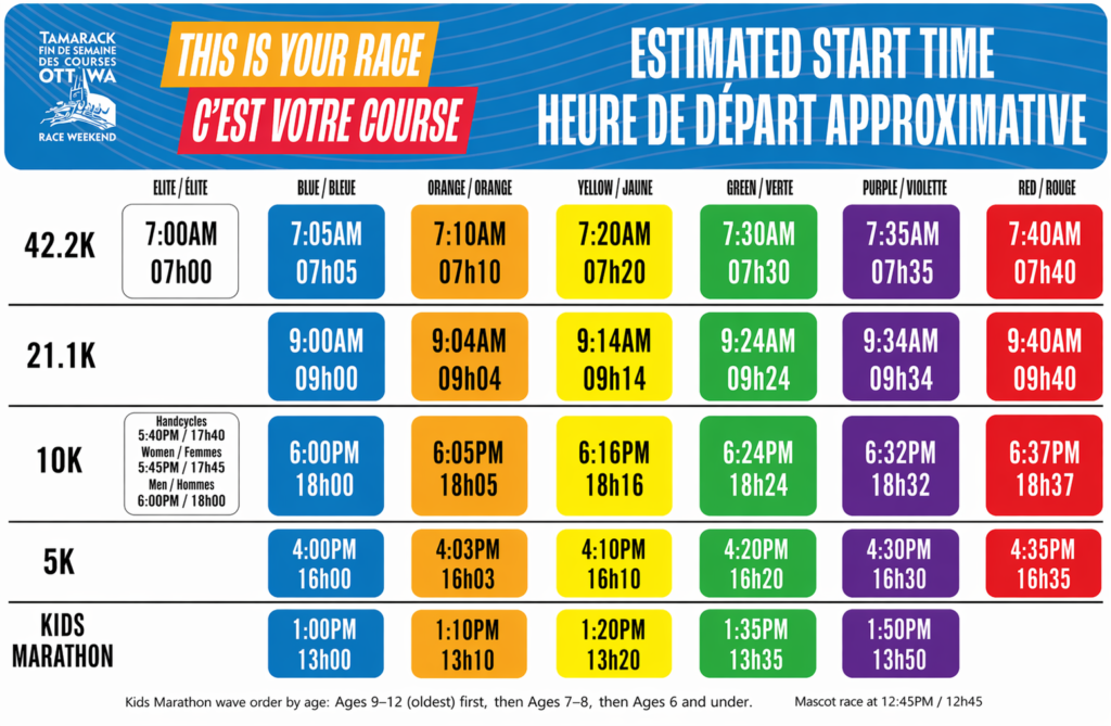 Each start line area will be divided into CORRALS designated by coloured flags that correspond to the coloured bars on your Tamarack Ottawa Race Weekend race bibs The colour on your bib represents the projected finish time you selected when registering. PLEASE line up in the corral that matches the colour on your bib.